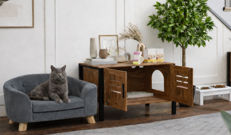 PawHut Cat Litter Box Enclosure with Tall Legs, Scratching Board, Double Doors, Ventilation Holes, 80 x 45 x 50 cm, Dark Brown