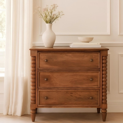 Solid Mango Wood Spindle Chest with 3 Drawers and Turned Spindle Legs, Bedside Cabinet with Ample Storage, 35L x 80W x 80H cm, Brown