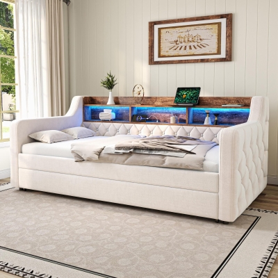 Space-Saving Sofa Bed with Adjustable LED Lighting and USB-C Port, Bed Frame with Built-in Storage Shelf, 201L x 107W x 75H cm, Beige