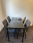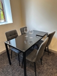 A simple yet classy table for a small family. It was delivered with care and was easy to assemble. The frame is made of metal, so it's pretty strong. The black tempered glass looks beautiful on it. However, I would recommend using table-mat to protect it from scratch.