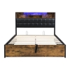 4ft6 Wooden Double Bed with LED Strip Light and Headboard Storage, Storage Bed with Charging Port, 208L x 137.5W x 104.5H cm, Natural+Black