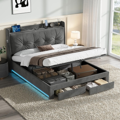 King Upholstered Bed Frame with Hydraulic Storage, LED Light, PU Leather Ottoman Bed with Charging Station, 217L x 152W x 115H cm, Grey