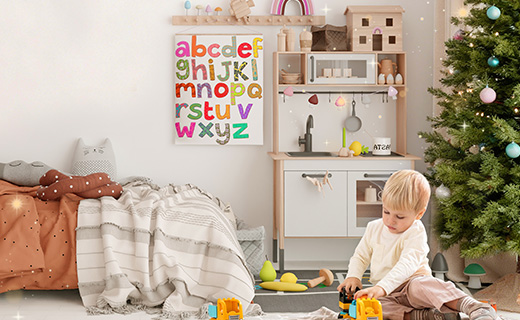 A cosy corner where holiday dreams come true — twinkling lights, a glowing fireplace, and a soft wooden bed ready for morning surprises. Bring warmth, wonder, and festive joy to your child’s room this Christmas.