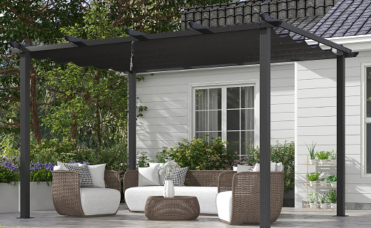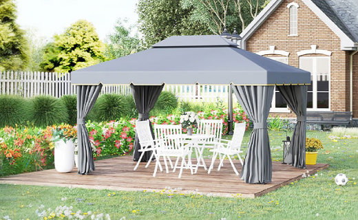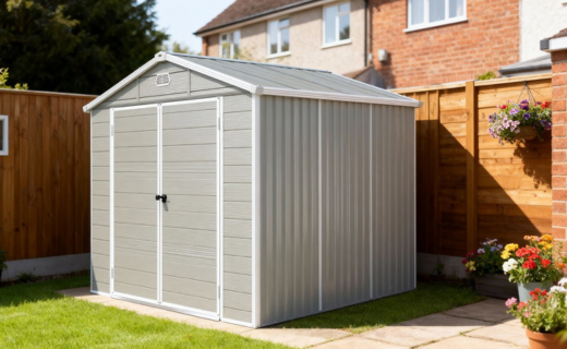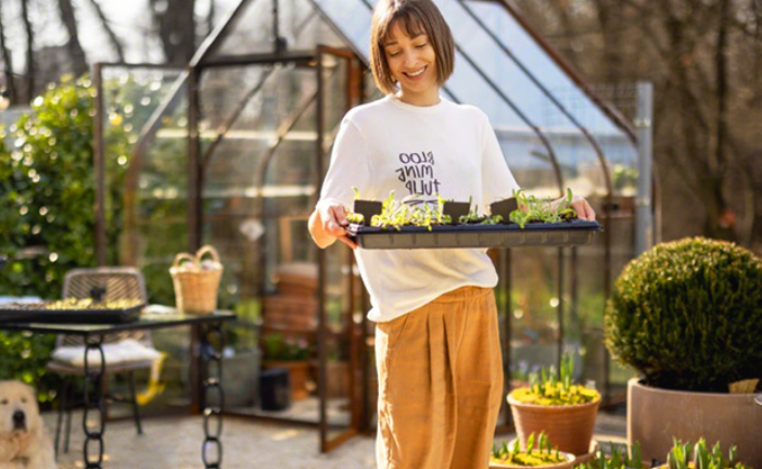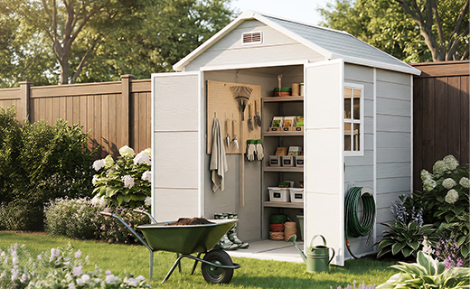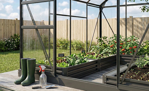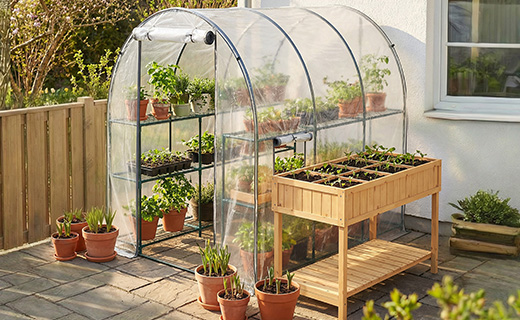 Keep planting with the greenhouse, store tools neatly in the cabinet, and protect your garden furniture with covers — cosy, organised, and ready for autumn days.
