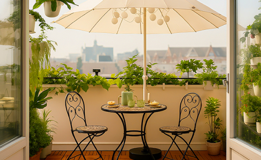 A compact brick balcony thoughtfully styled with a bistro set, layered planters and soft cushions - proof that even the smallest space can feel calm, welcoming and beautifully lived in.