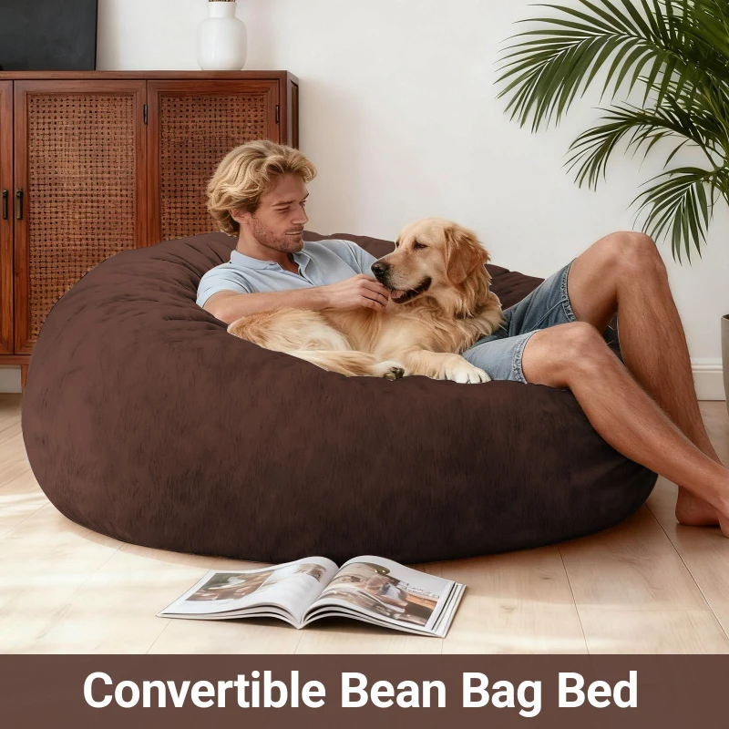 2-In-1 Convertible Bean Bag Chair Bed with Removable Machine-Washable Cover, Giant sofa with Soft Liner, 110L x 110W x 70H cm, Brown