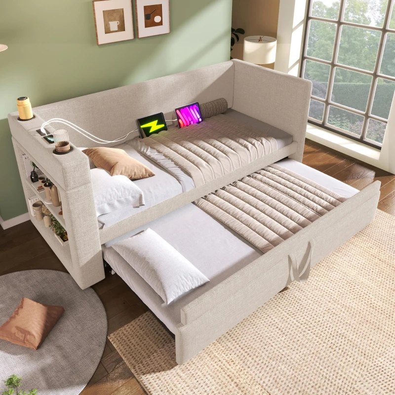 3ft Upholstered Daybed With Cup Holders, 3 USB and Type‑C Charging Ports, Single Sofa Bed for Compact Room, 207L x 98W x 74H cm, Beige