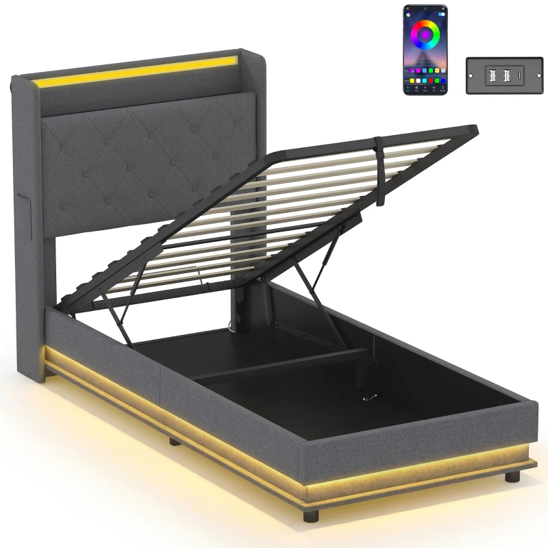 HOMCOM 3ft Single Bed Frame with Headboard, Platform Bed Frame with Hydraulic Storage, LED Lights and Charging Station, Grey