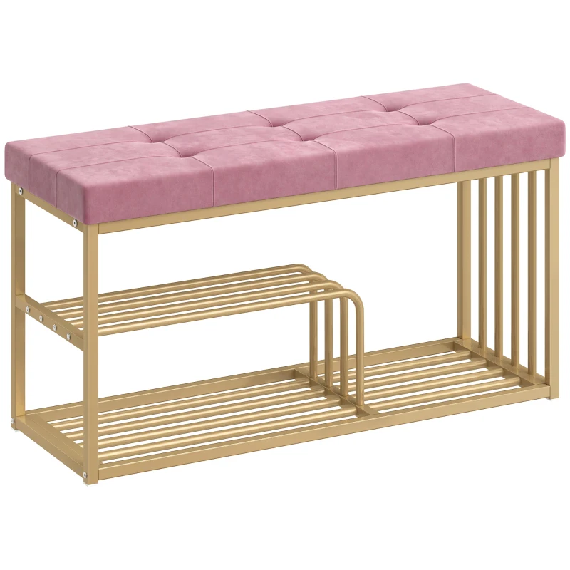 HOMCOM Bench and Shoe Storage, Tufted Shoe Storage Bench with Velvet Seat Cushion Gold Steel Frame for Entryway, Pink