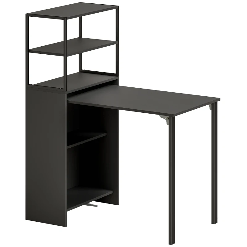 Merging two home essentials in one, comes this HOMCOM home office desk. A four-tier shelf, with a folding desk: at just 30 cm wide when folded as one, it takes up minimal room - great for smaller office and homes. Two of the shelves are exposed at the top, with the two lower shelves hidden at all times. Unfold the table and there's 105 x 60 cm workspace for you - plenty of room to work.