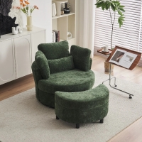 Chenille Swivel Armchair with 3 Back Cushions and Crescent Ottoman Stool, Green