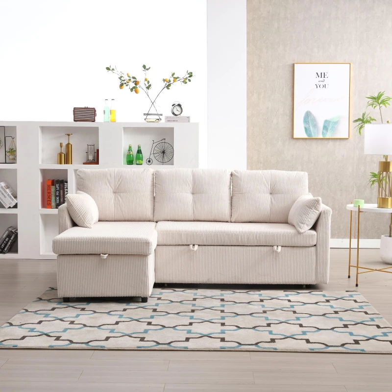 L-Shaped Convertible Sectional Sleeper Sofa with Pull Out Bed, 3-In-1 Convertible Sofa with High Storage Chaise, 206L x 130W x 88H cm, Beige