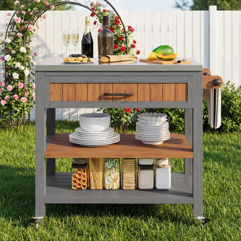 Mobile Wood Tool Cabinet with Stainless Steel Worktop, Weatherproof Barbecue Station for Outdoor Use, 80L x 51W x 91.5H cm, Natural