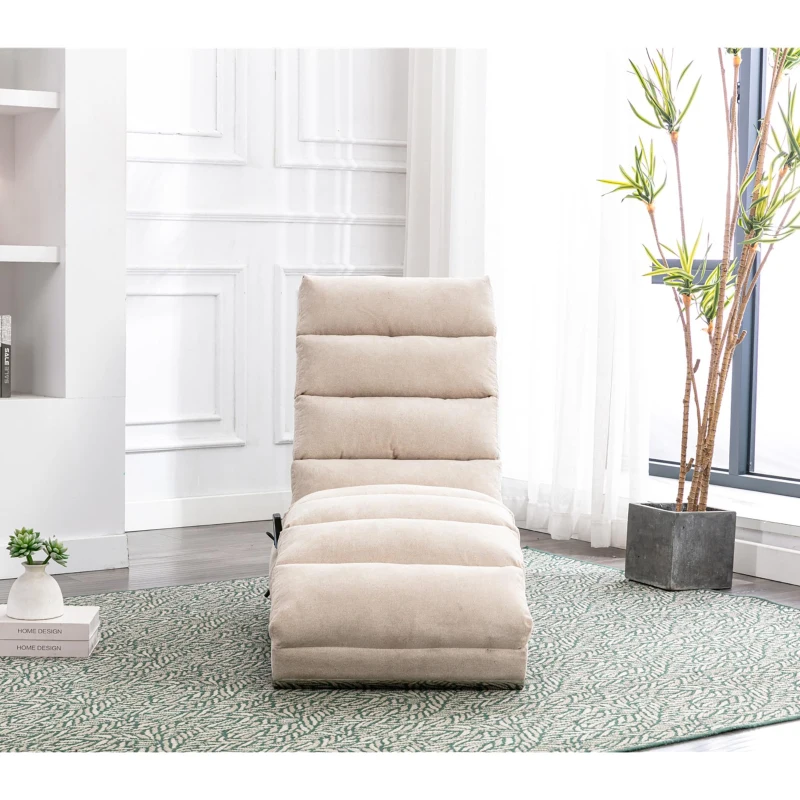 Modern Chaise Longue with Side Storage Pocket and Fixed 140° Backrest, Linen Deck Chair for Living Room, 148L x 55W x 87H cm, Beige