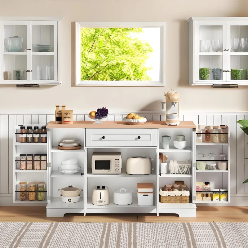 Multifunctional Kitchen Sideboard with Double-Door Compartment, Spacious Cabinet with Adjustable Shelves, 138L x 40W x 85H cm, Natural+White