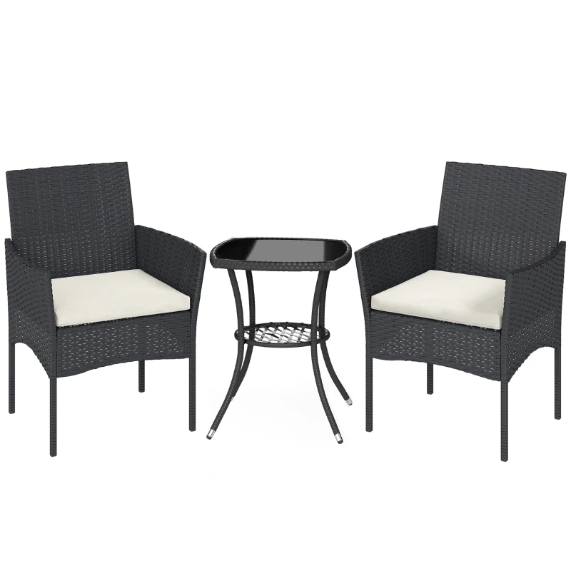 Outsunny 3 Piece Rattan Bistro Set, PE Wicker Garden Furniture Conversation Set with 2 Tier Glass-Top Table, Chairs, Cream White