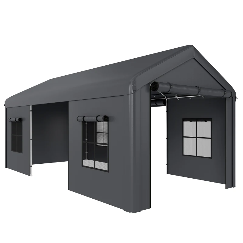 Outsunny 3 x 6 m Heavy Duty Carport, Portable Garage Car Canopy Tent with Galvanised Frame, Doors, Windows, Dark Grey