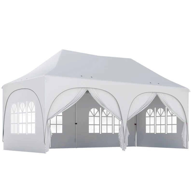 • 3 x 6 m peak-top canopy: A spacious 3 x 6 m shelter great for weddings, parties and gatherings, featuring a peak-inspired roof with curved valance and church windows for a refined look. Three push-button height settings let you adjust the gazebo as needed