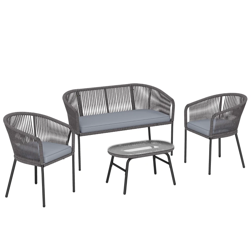 Outsunny 4 Piece Garden Furniture Set, Rope Garden Sofa Set with 1 Loveseat 2 Chairs Tempered Glass Table Cushions, Dark Grey