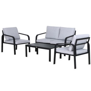 Outsunny 4 Piece Metal Garden Furniture Set with Tempered Glass Coffee Table, Texteline Pocket, Outdoor Set Loveseat Single Armchairs with Padded Cushions, Khaki