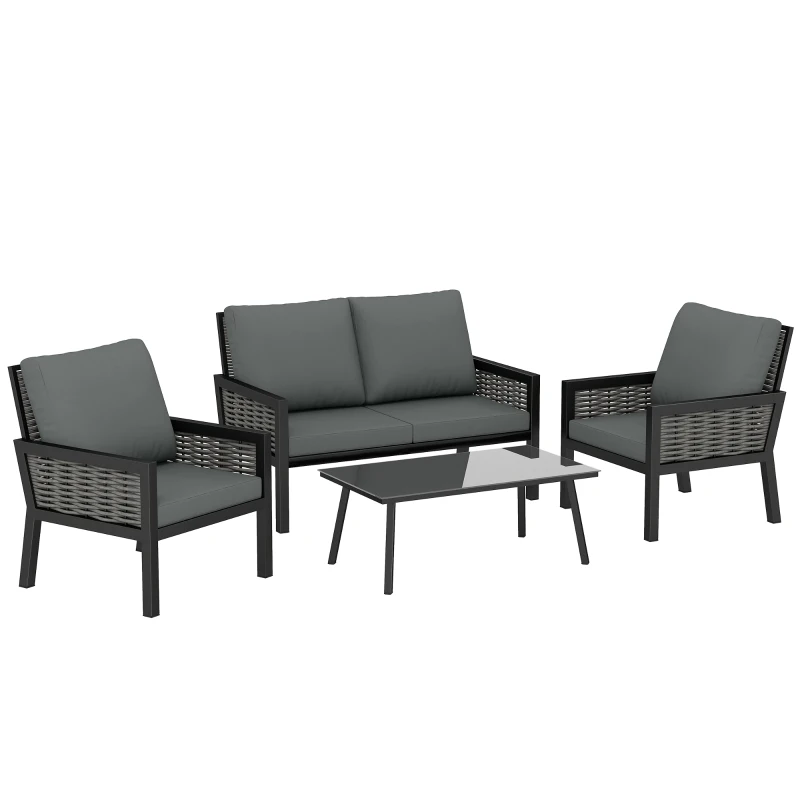 Outsunny 4 Seater Rattan Garden Furniture Set with 2 Armchairs, Loveseat, Coffee Table, Garden Sofa Set with Cushions, Dark Grey