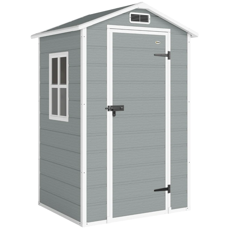 Outsunny 4 x 3 ft Plastic Garden Shed with Floor, Outdoor Storage Shed with Lockable Door, Window and Vent, Light Grey