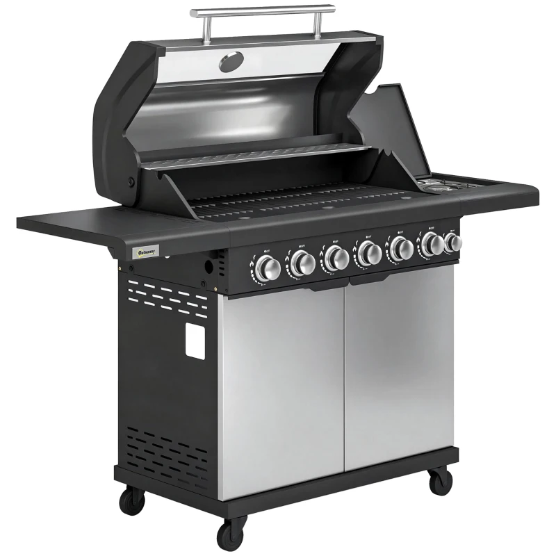 Outsunny 6+1 Burner Gas BBQ Grill, Outdoor Barbecue Trolley with Wheels, Warming Rack, Thermometer, Bottle Opener, Silver Tone