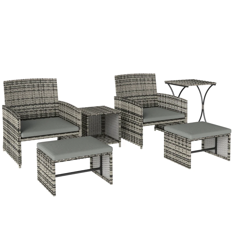 Outsunny 6 Piece Rattan Garden Furniture, Space-Saving Patio Furniture Set with Nesting Tables, Chairs, Stools, Cushions, Grey