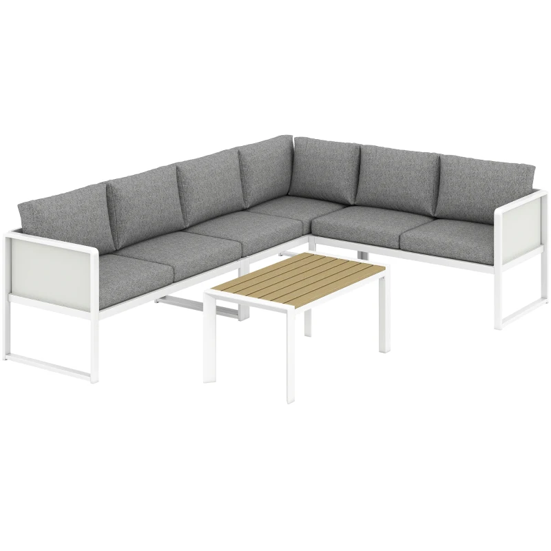 Outsunny 6 Seater Metal Garden Furniture Corner Sofa Set with 3 Loveseats, Faux Wood Table, Texteline Seat, Cushions, White
