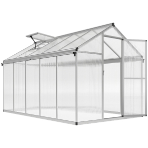Outsunny 8 x 12ft Aluminium Greenhouse Polycarbonate Walk in Garden Greenhouse Kit with Adjustable Roof Vent, Double Sliding Door, Rain Gutter and Foundation, Clear