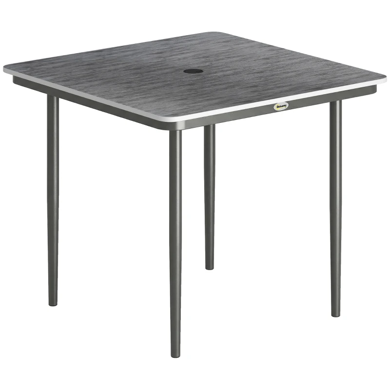 Outsunny Garden Dining Table for 4, 85 cm Square Outdoor Table with Umbrella Hole, Faux Wood Top, Metal Legs, Dark Grey