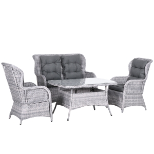 Outsunny Garden PE Rattan Dining Sofa Set, Outdoor 4 Seater Wicker Furniture, High Back Chairs with Cushions, Tempered Glass Coffee Table for Patio, Light Grey