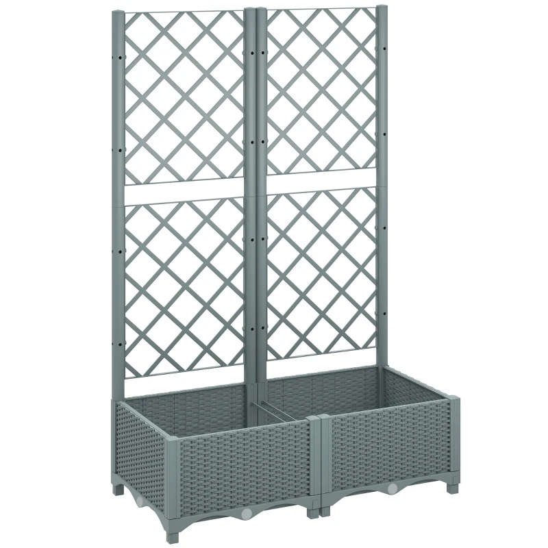 Outsunny Raised Garden Bed with Trellis, Plastic Planter Box with Drainage Holes, Drain Plugs and Water Reservoirs for Climbing Plants, Vegetables, Flowers, Grey