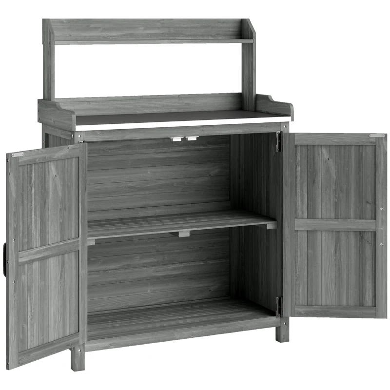 Outsunny Wooden Potting Bench Table with Aluminium Worktop, Outdoor Garden Workbench with Top Shelf and Cabinet Storage