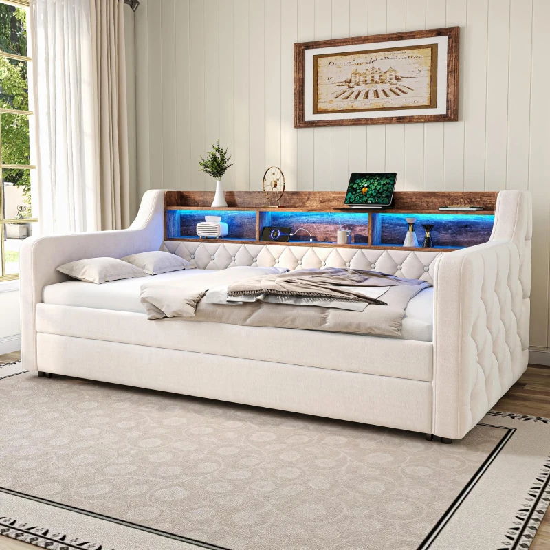 Space-Saving Sofa Bed with Adjustable LED Lighting and USB-C Port, Bed Frame with Built-in Storage Shelf, 201L x 107W x 75H cm, Beige