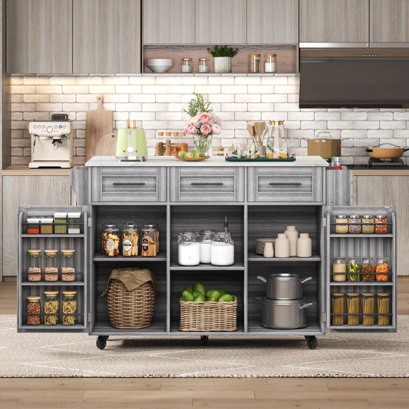 Stylish Kitchen Trolley with Foldable Wood-Grain Countertop, Versatile Buffet with Interchangeable Wheels, 139L x 46W x 91H cm, Gray(m-4)