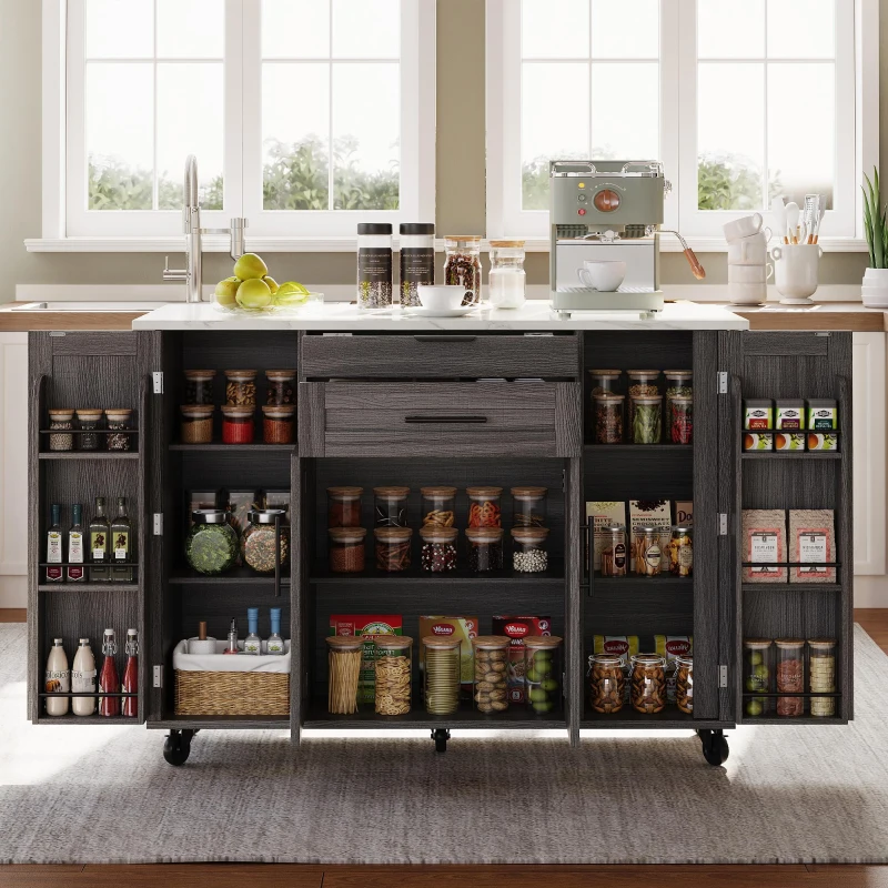 Versatile Kitchen Trolley with Fold-Out Worktop and Lockable Castors, Spacious Kitchen Island with Cabinets, 136L x 70W x 92H cm, Gray